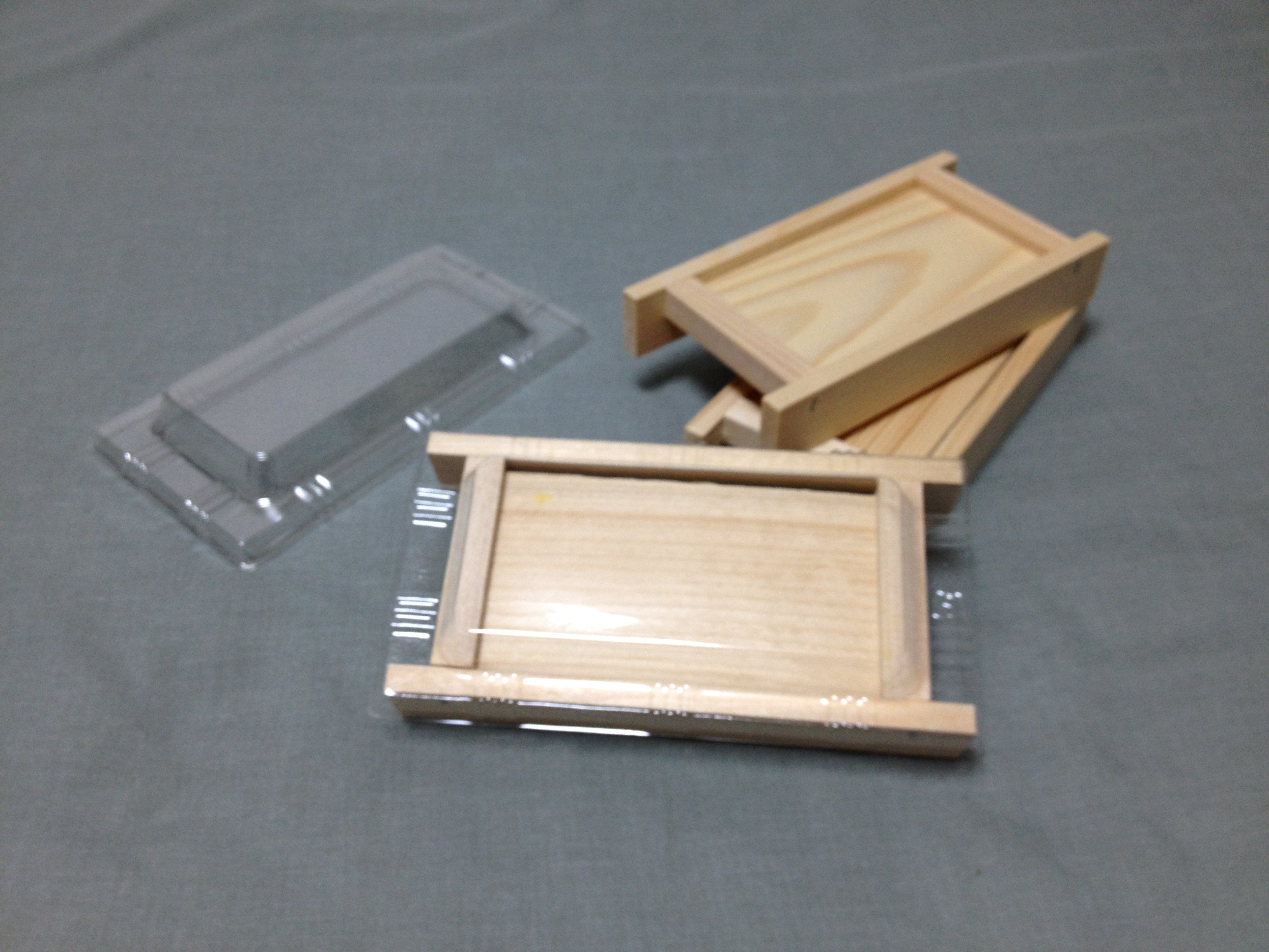 木材の弱点である、水分のある内容のものを入れていけるよう、自社でPET素材のトレーやフタを製造し、木箱とセットにして販売もしております。自社木箱サイズのトレー、フタであれば、価格を抑えた成型型を使用できますので、低予算で製造が可能です。