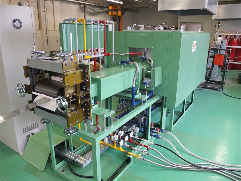 連続光輝焼鈍炉、MINO0.05mmまでの金属箔を最大1,100℃で無酸化焼鈍が可能、水素+窒素 アルゴン雰囲気が使用できます。